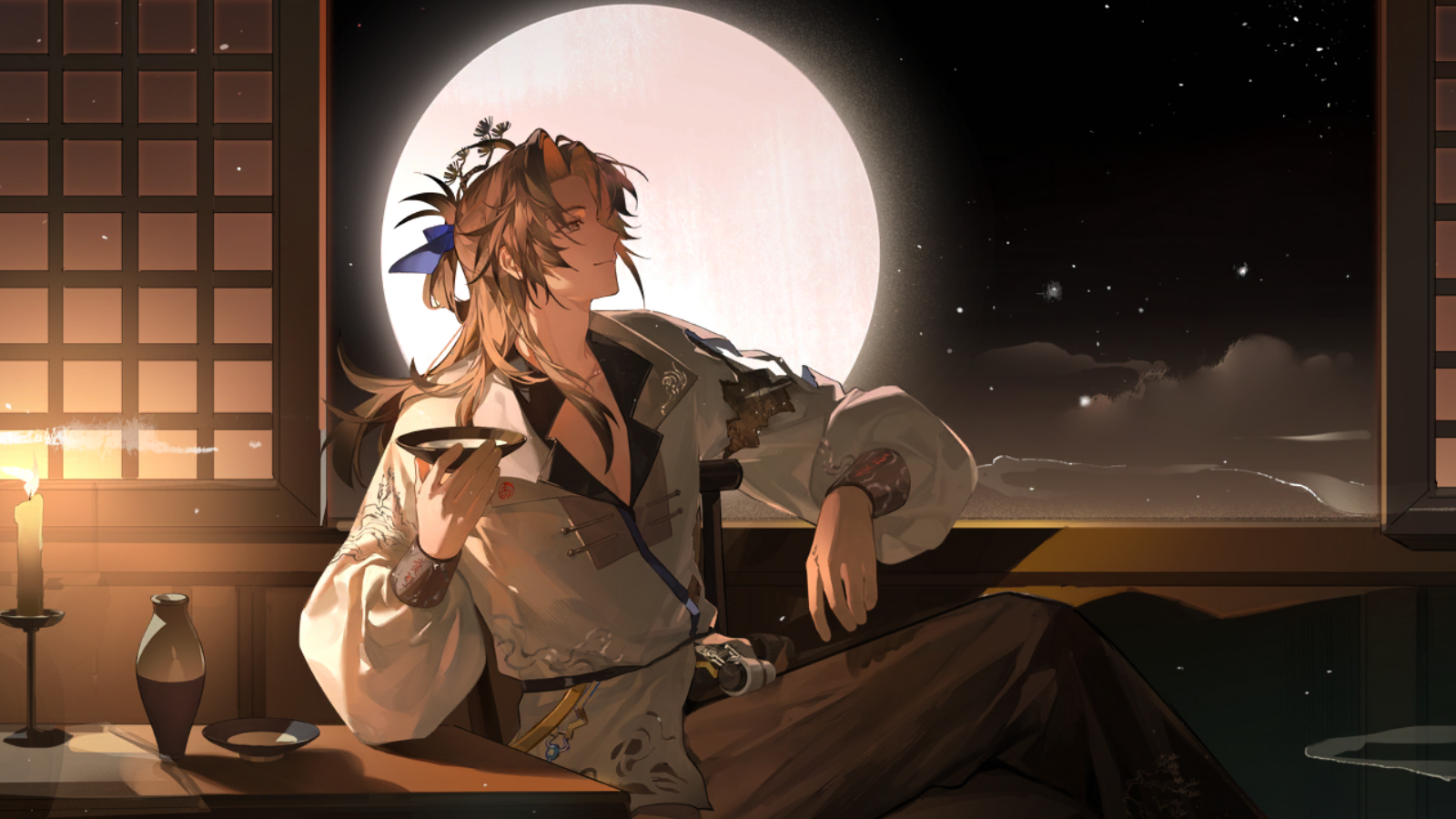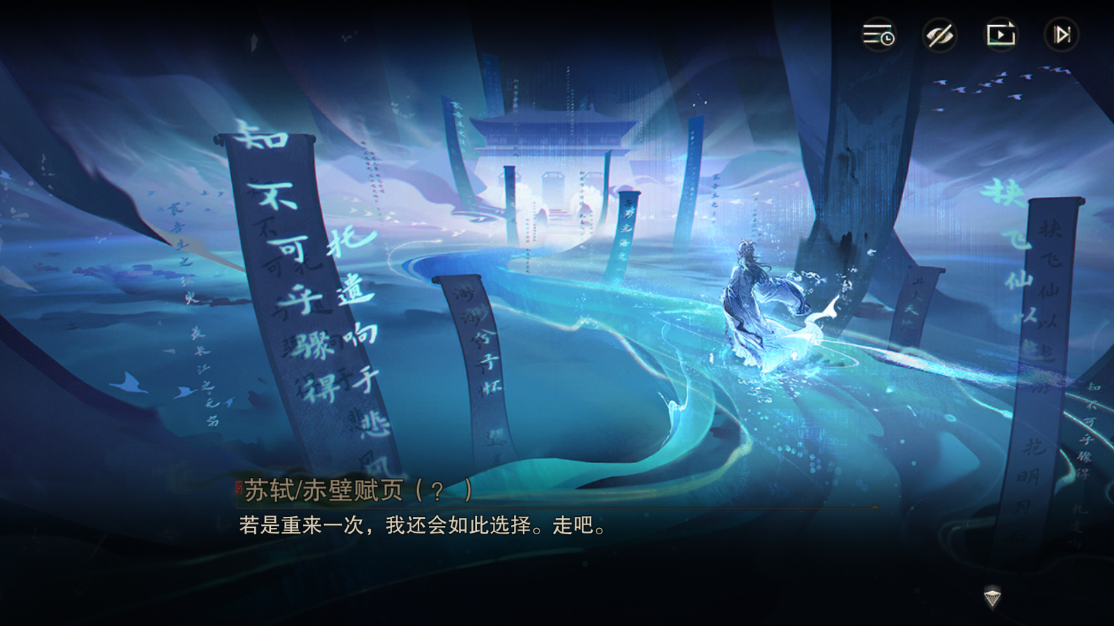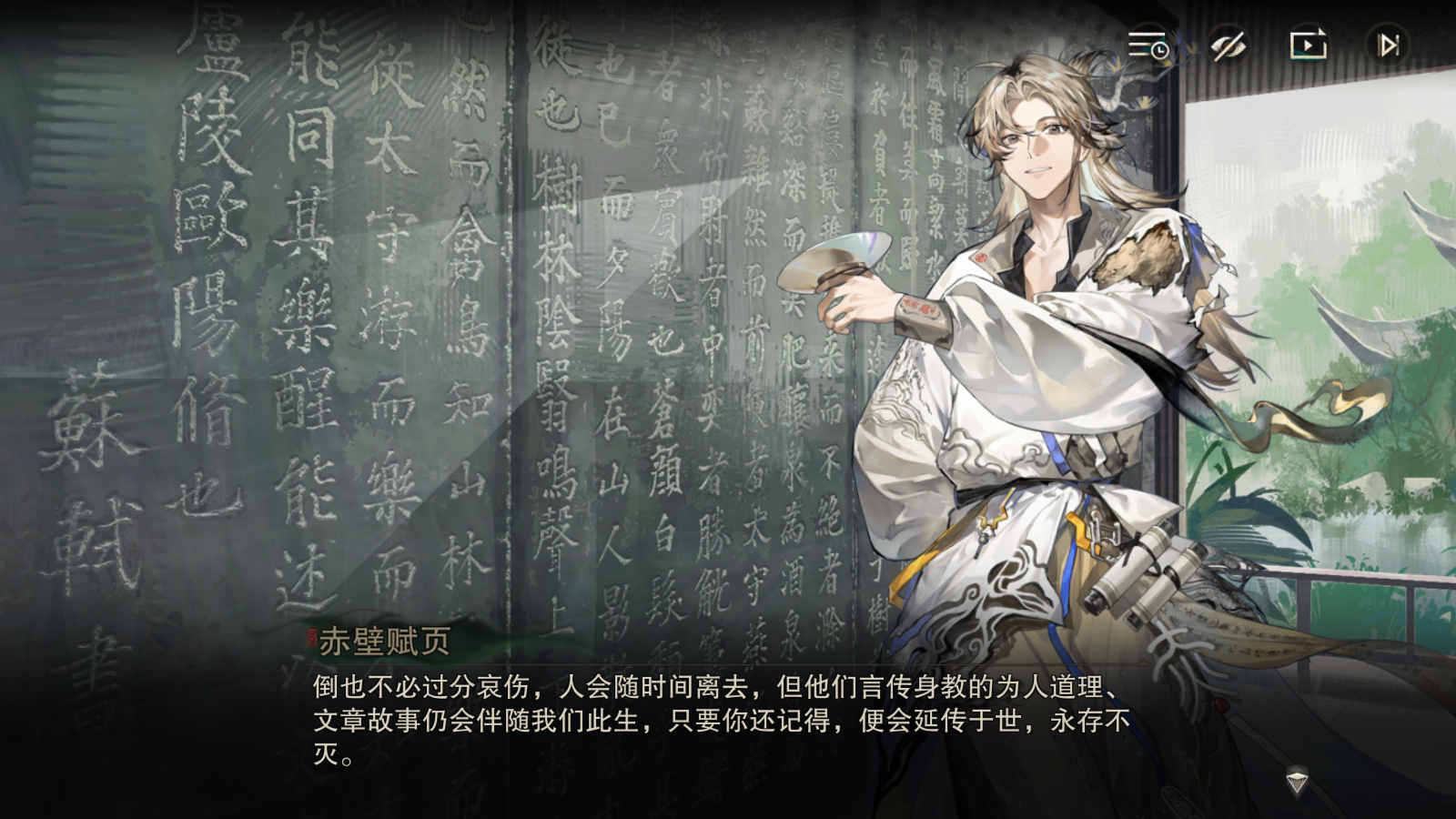 最后补充一个剧情里很棒的前后对比。在一开始赤壁赋页使出浑身解数躲避基金会到故宫,和上阳台帖饮酒时,说的祝酒词里敬了一圈,但是不曾“敬你我”;在委托结尾他在江边,与自我和解之后,举杯同样是敬了一圈,最后的落点却是“敬我自己”。