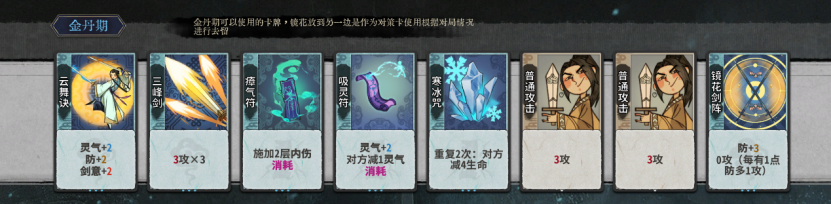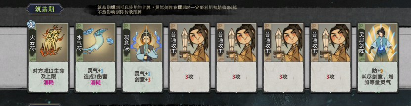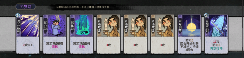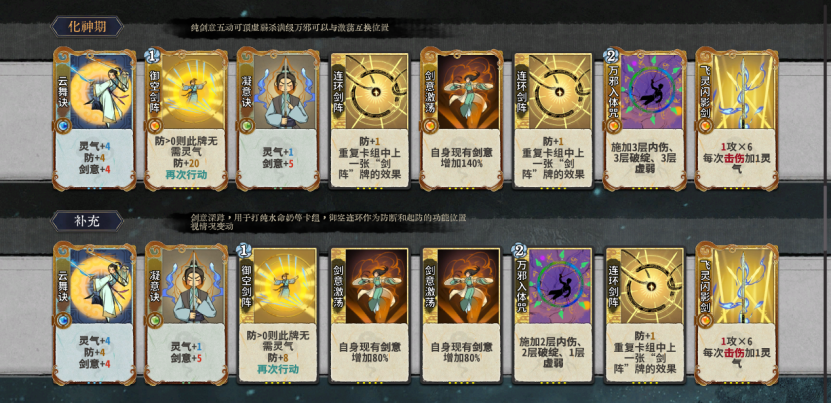 补充:前期剑挡可以不合用两个二级剑挡保证一圈伤害足够,在获得其他剑意卡比如凝意云舞时可进行合成。灵气灌注在对局有土老虎等需要穿甲对策的角色时可以留着打灌注万法。如果没有需要对策的卡组后期可以炼化。