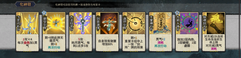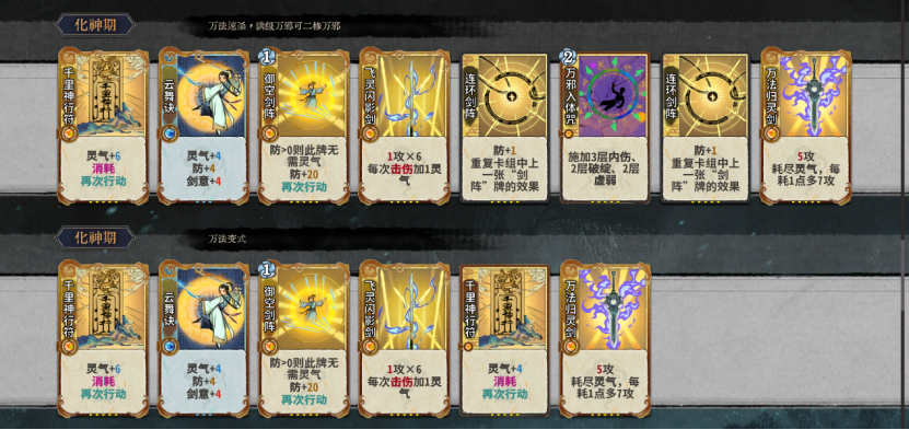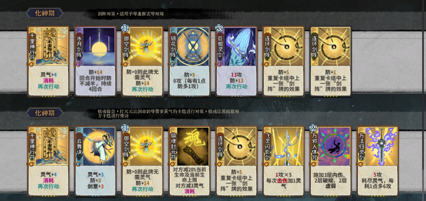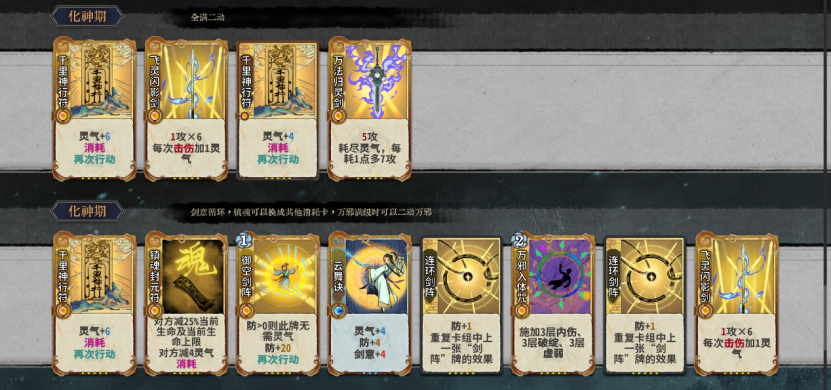 本套路顾名思义就是打剑意,流云乱剑作为一张多段卡可以作为剑意的输出终端,同时作为元婴卡可以有效的提升元婴期战力提高容错。飞灵闪影剑同上但是作为化神卡战力变现较晚故在流云之后,这里有一点要注意的是道韵飞灵必点化神仙命云泉道茶,这样突破化神就能获得一张五段剑意终端能快速稳定战力。