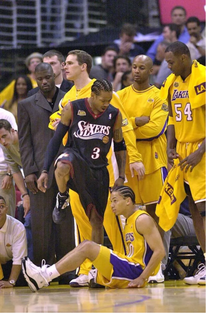 对手是拥有OK组合如日中天的洛杉矶湖人,季后赛此前11连胜,横扫西部。全世界都认为这将是一场轻松的横扫。总决赛第一场在洛杉矶,湖人开场打出16-0的完美开局。绝境中,艾弗森半场独取30分,全场鏖战52分钟,砍下48分6助攻5抢断。加时赛最后时刻,他在底线用一记经典的crossover晃倒泰伦·卢,命中跳投,然后从倒地的卢身上跨过——这成为了NBA历史上最具争议也最具标志性的画面之一。