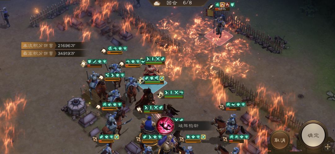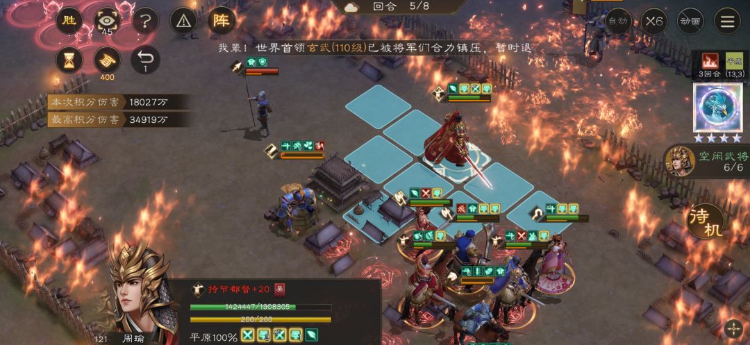 第二回合-第五回合注意事项:切记我军按兵不动不打上面的三个回血武将,主要是靠反击来清理杂兵。确保许褚的血量,周瑜自由人清理杂兵,顺便灼烧右侧传令兵,小乔负责回血,保上阵武将安全。