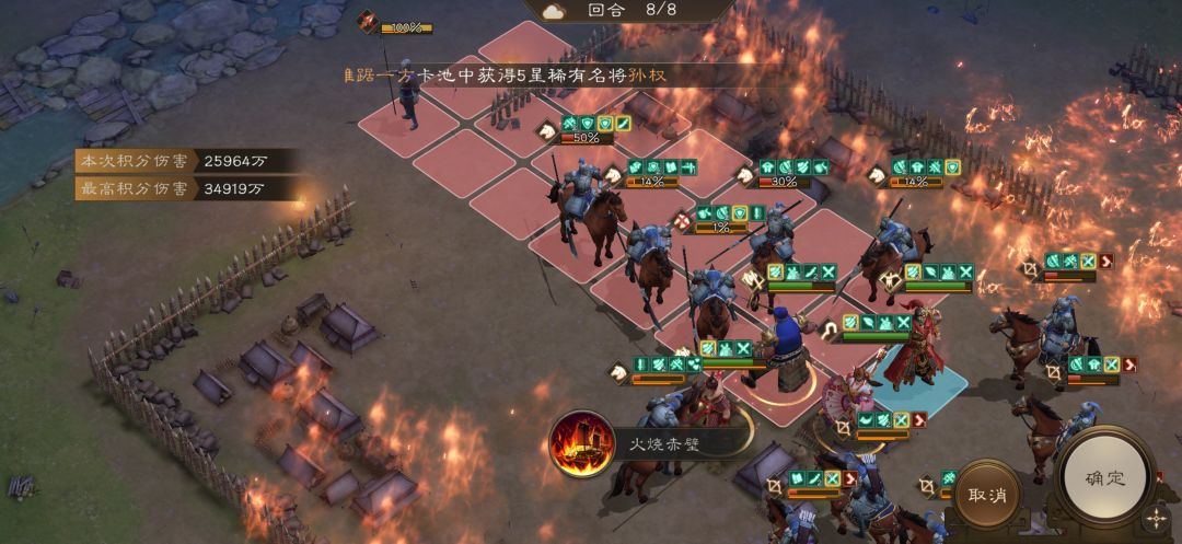 第一回合准备工作-站位如图所示,许褚站到下方回血城寨内给甘宁辅助护卫,甘宁站在许褚上方将曹操拉过来,孙权左边铺地形,周瑜灼烧上方武将再动到右侧,小乔站右侧辅助,曹操站下方辅助。
