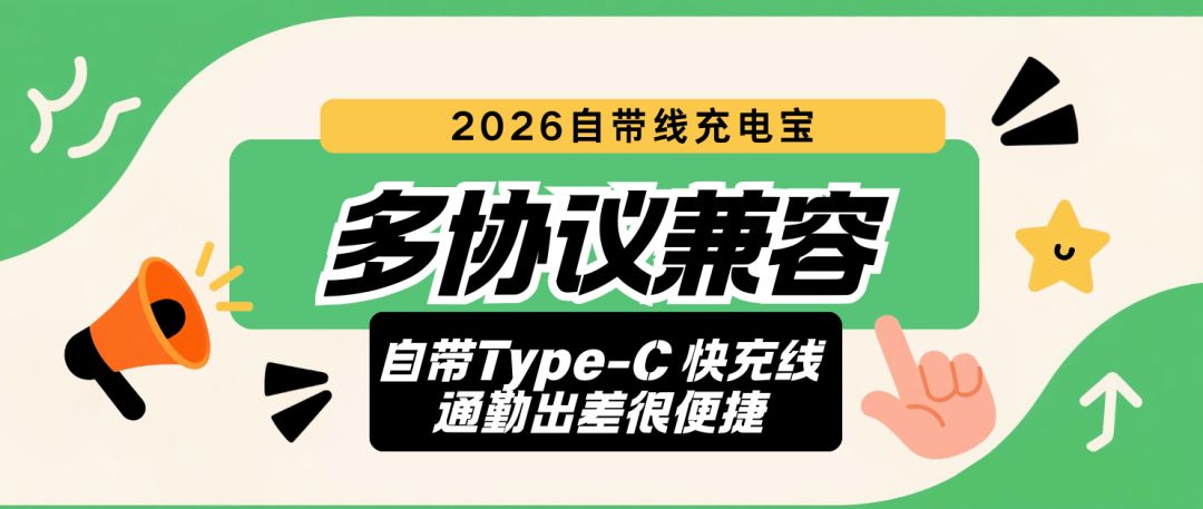 2026自带线充电宝,多协议兼容,自带双快充线,通勤出差很便捷
