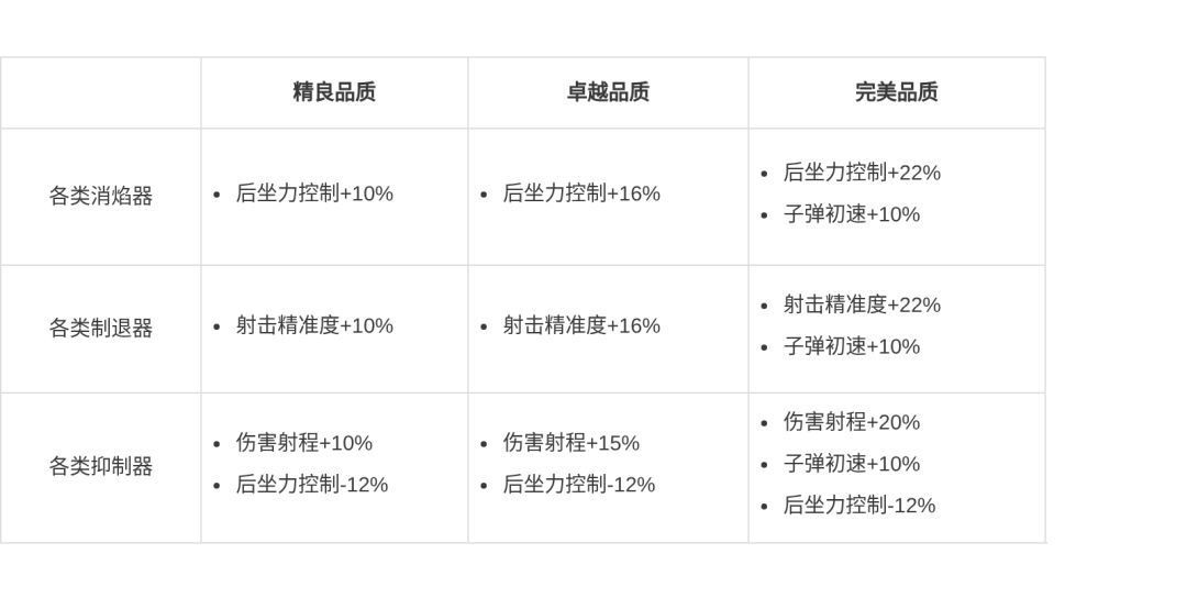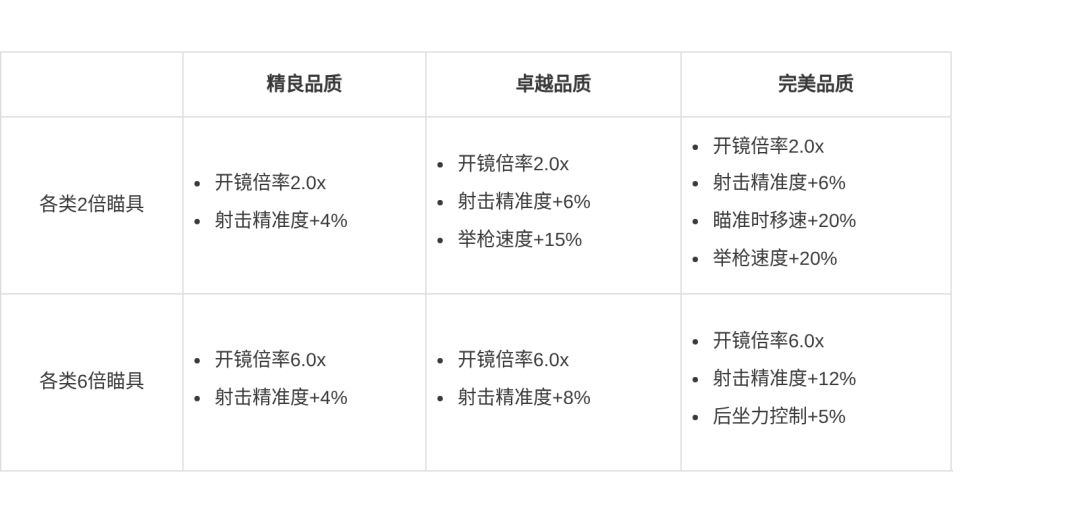 3、统一同类型配件的加成效果(如:精良品质的2倍瞄具,其加成效果均为开镜倍率2.0x、射击精准度+4%)。