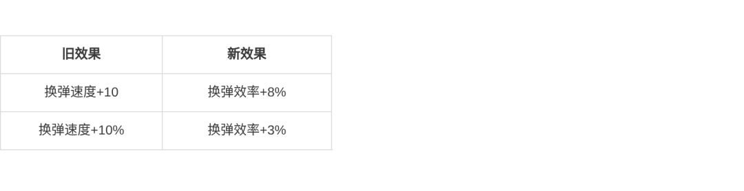目前游戏内存在3种关于枪械换弹时长的属性加成,这对部分玩家判断收益造成了困扰。保证不影响实际换弹时长的前提下,将已有3种换弹时长属性统一为“换弹效率”这一属性。