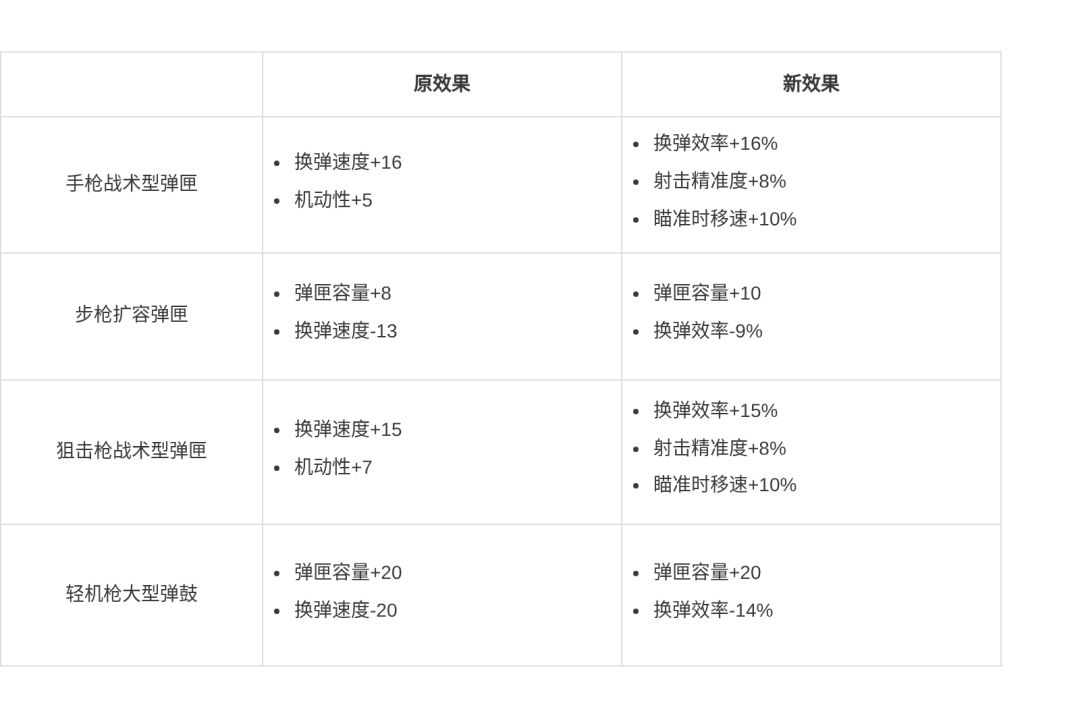 通过这次调整,枪械在搭配各类模块对换弹的养成数值后,实际的换弹时长会比之前更短。在替换成换弹效率后,枪械的加成数值相比之前有进一步提升。