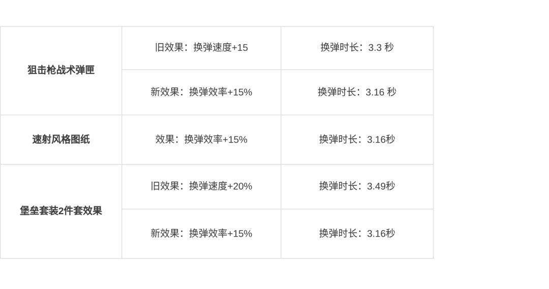 - 下表分别装备弹匣、速射风格图纸和防具套装效果后对应的换弹时长变化
