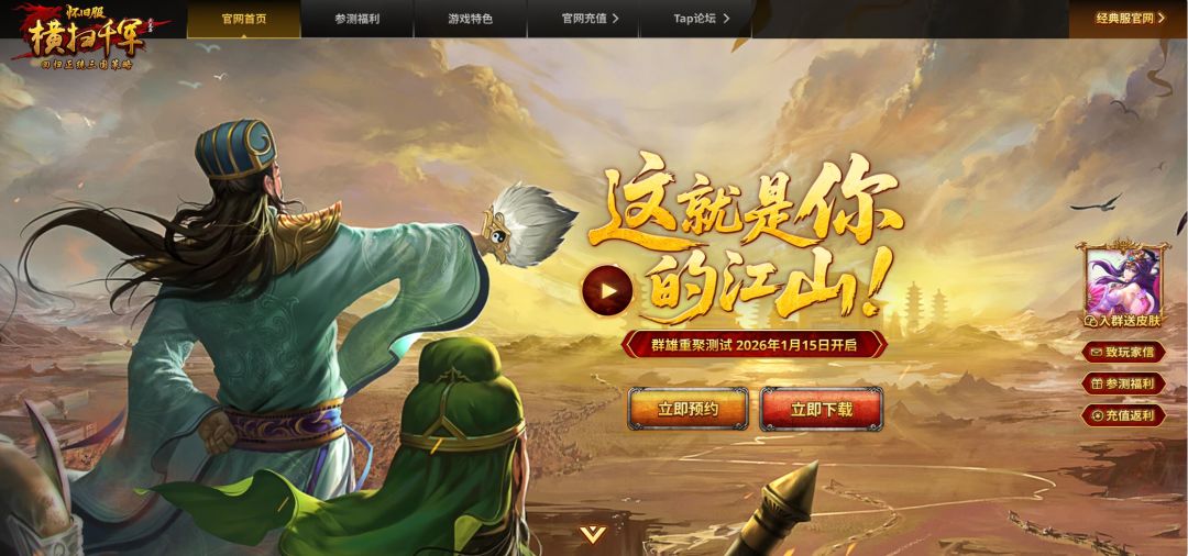 烽烟再起,沙场的大门已为您敞开——《横扫千军怀旧服》「群雄重聚测试」于今日(1月15日)上午10:00,正式开战!