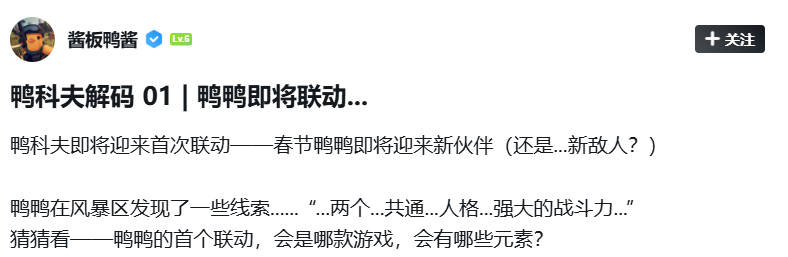 官方暂未披露联动对象与具体内容,仅释放一组神秘线索制造悬念:“春节鸭鸭即将迎来新伙伴(还是... 新敌人?)”,同时曝光鸭鸭在风暴区发现的关键提示 ——“... 两个... 共通... 人格... 强大的战斗力...”。简洁的线索让联动方向充满想象空间,玩家纷纷在社交平台猜测合作游戏归属,以及将解锁的全新玩法与角色互动形式。