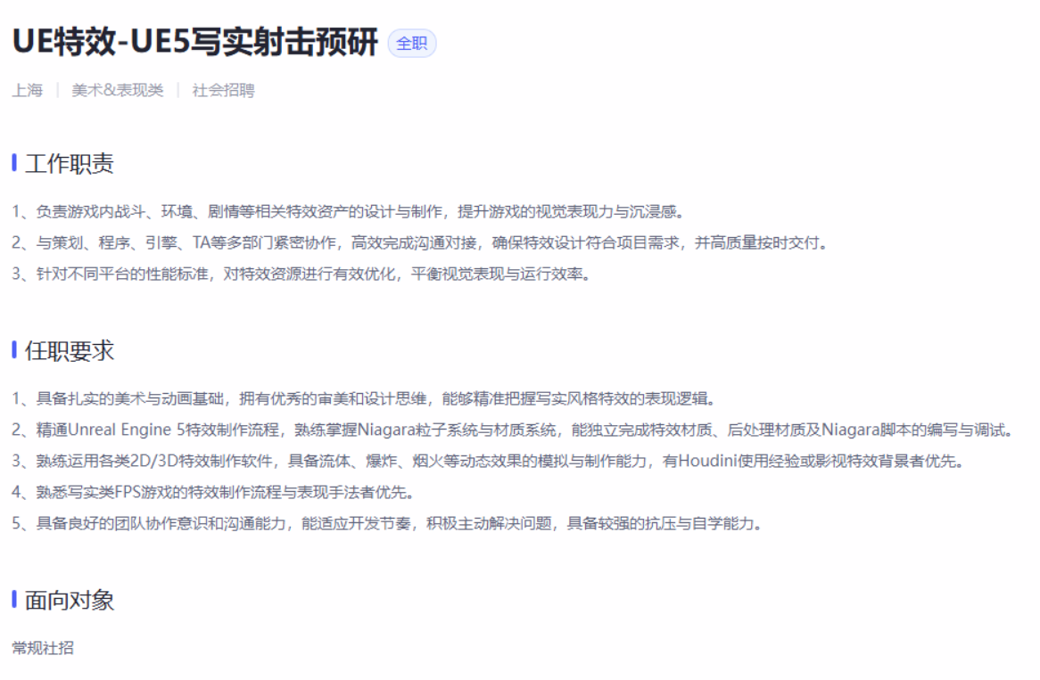 据悉,这款新作已明确采用行业领先的UE5引擎开发,技术基底备受期待。目前官方正面向游戏行业广泛招募核心岗位人才,覆盖多个关键研发领域,包括特效设计、美术创作、服务器开发及客户端开发等,全力组建新游核心研发团队。