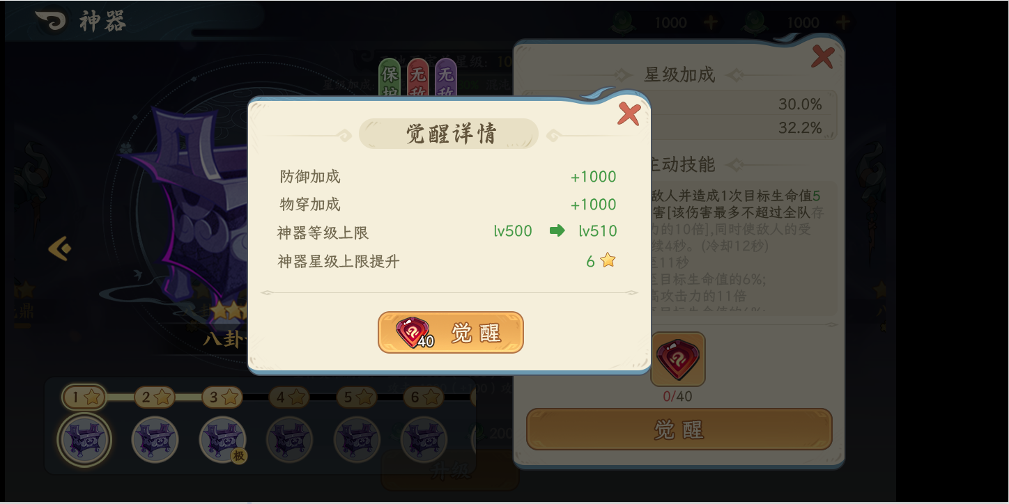 可通过觉醒石对神器进行觉醒,觉醒效果可提高神器的等级上限与星级上限,同时觉醒会带来对应基础属性加成(如攻击、防御、生命等,按神器定位生效),并随觉醒阶段/星级成长逐步放大。