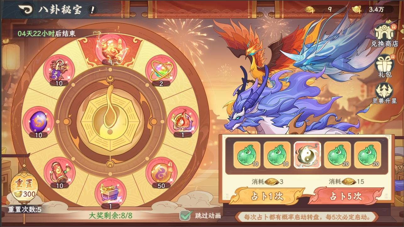使用指定道具可获得自选神话灵兽等奖品;可使用元宝限量兑换抽卡道具。