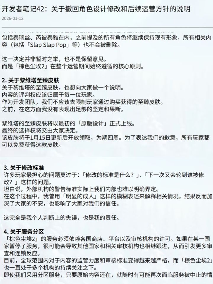 🚨面对汹涌舆情,官方于1月12日开启紧急直播,制作人李俊熙公开致歉并宣布重磅反转:撤回所有角色设计修改,《Slap Slap Pop》音游与原版立绘全部保留,黎维塔的至臻皮肤将以最初设计免费发放给全体玩家,领取周期长达4周。后续官方将采用“分地区适配”原则,不再统一修改内容,而是针对特定地区推出专属版本或隐藏争议内容,保障原版玩家体验。