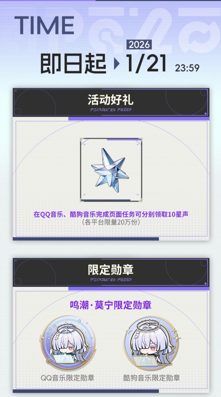 ✅️本次联动福利诚意拉满,核心奖励直击抽卡刚需:即日起至2026年1月21日23:59,漂泊者只需打开QQ音乐或酷狗音乐,搜索关键词「鸣潮」进入活动页,完成简单关注、听歌任务,即可分别领取10星声奖励,双平台累计可免费解锁20星声!