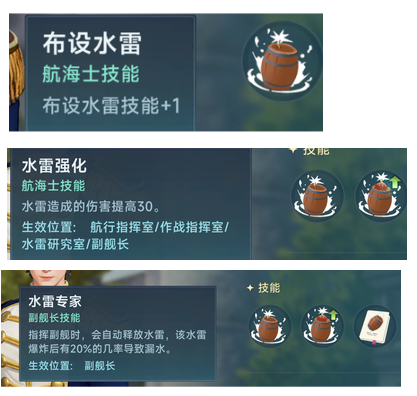 巴尔加斯的觉醒技能是轰音水雷,水雷在爆炸的时候会20%概率造成混乱,这个技能看似和水雷专家差不多,但是要知道,在这个游戏中,排船冲锋的概率是远远高于炮船的,炮船踩到的水雷一般是没有排船多的,而水雷作为抗排先锋,把排船炸混乱比炸漏水效果要强力的多,试想一下,一个排船冲锋过来马上到你脸上,然后踩了个水雷把自己炸混乱了是有多尴尬,这时候贴也不是,不贴又会被炮船近距离射击(伤害很高)甚至集火,那么这个排船大概率会当场寄掉,所以这个技能是比水雷专家要稍微厉害一点的,至于概率问题,20%的概率看似不高,但是实战中水雷是经常连续释放的,如果敌人在进行路上趟过不止一个巴尔加斯释放的水雷,那这个概率就会比想象中高一些,当然要是实际打起来还是要看一些脸的,不过哪怕不触发混乱,仅触发一个漏水那也是极好的,总之这两个技能叠起来使得巴尔加斯释放的水雷对排船极具威胁性。