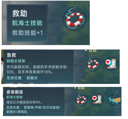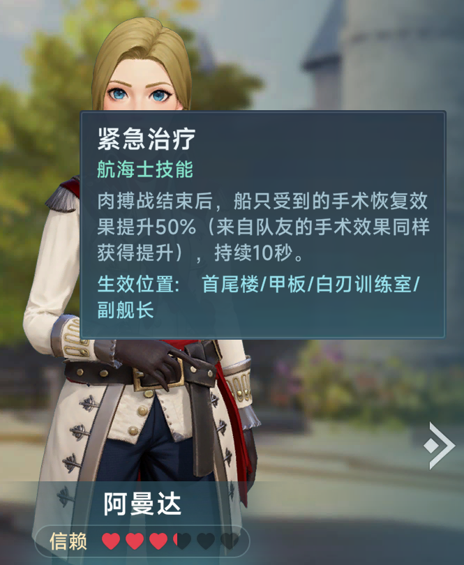 阿曼达的觉醒技能是紧急治疗,肉搏结束之后,10秒内受到的水手治疗效果+50%,这个技能效果简单暴力,一般来说无论炮船还是排船肉搏结束之后我们大部分情况下,水手都是非常低的状态,此时无论是自己开手术还是队友开手术,都可以吃到这50%的加成,这个效果可以帮助我们迅速恢复水手数到行动线,(船只低于一半水手时会大幅度降低船速和炮击伤害)虽然看似效果很夸张,但是此技能也有一些小瑕疵,如果你是炮船,在肉搏中我们并不知道我们什么时候可以撤退成功,在未知情况下,队友的手术肯定是CD一好了就马上开出来给你续命帮助你多活一两轮,而导致大概率肉搏结束之后只能让自己的手术吃到+50%的增强治疗,而如果你是排船对砍,由于不知道谁会砍赢,队友的手术肯定也是好了就开给你奶水手,导致也吃不到这个50%的增益,这是这个技能的一个小问题,但是,这个技能也有一个优势,就是在5v5或者多人战斗环境下,如果有人是高配船医,在你脱离肉搏之后船医立刻开启集中支援这个技能,在船医的高手术等级和高额治疗量加持下,150%的一轮或者两轮手术能迅速救活你甚至给你水手拉到接近满都是有可能的,如果你是排船,这个效果只会更明显,足以让你迅速投入下一场肉搏战,这看起来非常的离谱