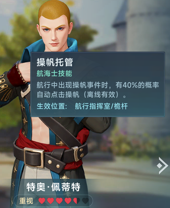 我们先来看一下操帆哥特奥,先看特奥本体的强度,特奥主属性是航海,副属性是炮术,特奥的航海属性中等偏上,属于t2档位(20片),比较优秀,由于其技能只能在桅杆或者航行指挥室生效,所以一般特奥只会固定在这两个位置,如果你练了海伦的情况下,特奥基本固定在桅杆位置(航行指挥室放汉娜或者海伦),这使得他的高航海属性可以提供客观的控帆效率,在叠加上自己技能的控帆效率5%,无论是海战还是跑商都可以带来强大的速度提升(逆风效果更强),其操帆时间+7更是对跑商和竞速提升均很大,特奥几乎是所有玩家人手一个的角色