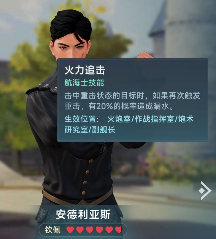 第二个战斗类航海士是安德里亚斯,我们依旧先来看其本体强度,安德利亚斯主属性为炮术,副属性为指挥,其拥有本游戏最高的炮术数值,为T1档(40碎片档),安德利亚斯只会安置在旗舰,最佳位置是炮术研究室,因为其极高的炮术属性可以为直接输出类炮船(普炮,二连炮)带来逆天的贯穿增伤,其次也可以放在火炮室来增加命中,这种情况一般存在于如果你不想为马尔科单独造一个作战指挥室而把马尔科放在炮术研究室,那么安德就只能去火炮室了,但是这样会比较浪费其炮术属性,然后是安德的主要技能重拳出击,这个技能是让所有普炮在射击额外增加10%的重击概率,虽然重击是一种不错的debuff,但是10%的概率未免有些偏低,如果你的普通炮不去额外洗重击词缀,单靠这个技能是没法频繁重击对手控制其船速的,然后友好交涉虽然非常不错,但是其毕竟是偏向跑商的效果,对于练战的玩家来说有价值,但是不是特别大