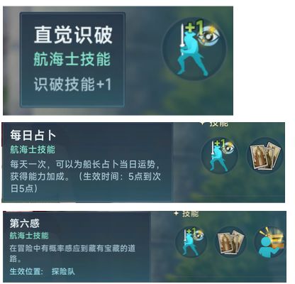第三个功能类航海士是莱亚,先来莱亚本体的强度,莱娅主属性为探险,副属性为剑术,莱娅的探险属性较高,为t1档(40碎片),莱娅的探险是游戏中探险仅次于苏菲的属性,莱娅的位置是探险队,但其本体的技能较为鸡肋,每日占卜可以为你提供一个持续一整天的大餐buff,看似很强,但是buff却是随机的,大部分时候你都不能获取到你想要的buff,还不如去对应城市吃大餐还靠谱点,而且所有buff在pvp环境都是没有办法生效的,第六感这个技能是在冒险中可以感应到宝箱房间,冒险中开野生宝箱是不需要体力的,这个能力看似不错,但是概率并不是很高,而且有时候宝箱房间并不是你想去的房间,比如你刚好残血,宝箱房间在强敌房而不在隔壁的篝火房间,这时候你很难抉择是摸箱子好,还是去篝火回血好,这个技能只能说有收益,但是不高,对比其技能,倒是莱娅的高探险和高剑术属性放在探险队中可以获得不错的肉搏和陆地攻防加成,不但对冒险增益颇高且在排船玩家中也有一定的意义,所以一般养莱娅也就只是为了其高额的探险和剑术属性收益