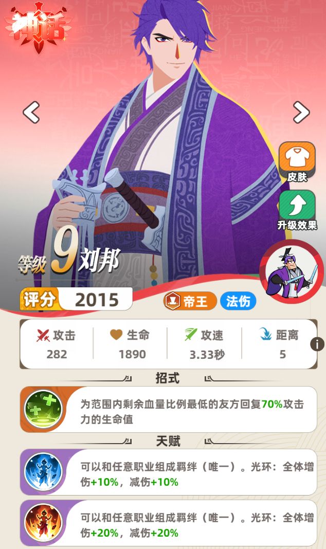 因为他的9级效果是可以和任意职业组成羁绊,也就是我们俗称的万金油。所以无论是对战还是挑战活动,9级刘邦都有着相当大的作用,9级之后没有硬性的等级要求,可以按照喜好和需求适当提升。