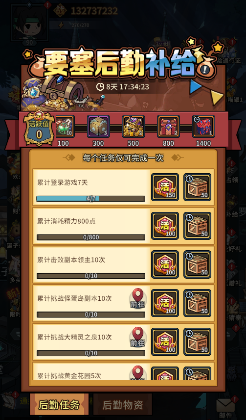1、活动期间完成活动的后勤任务可获得活跃值以及后勤补给箱