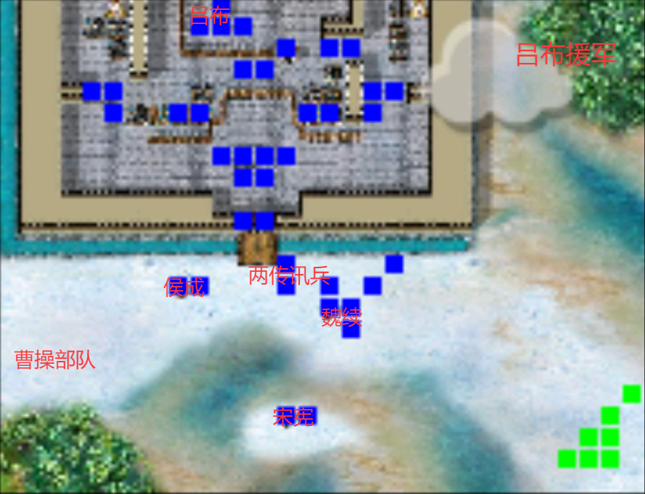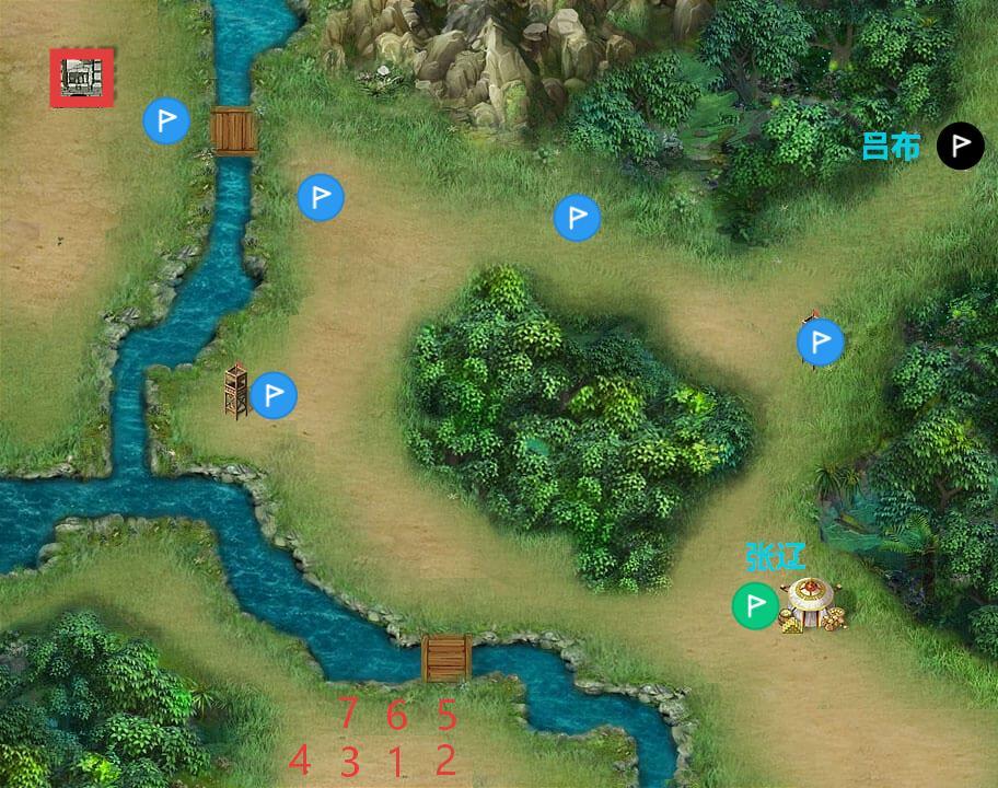 过桥往下打,整体来说不难,敌人是一波一波的;第八回合前击退纪灵过关;第八回合张飞在上方出现触发剧情,胜利条件变更为刘备到左上角鹿岩(0,2)过关;下一回合吕布部追兵在右上角绿旗处出现;全灭敌军也可过关