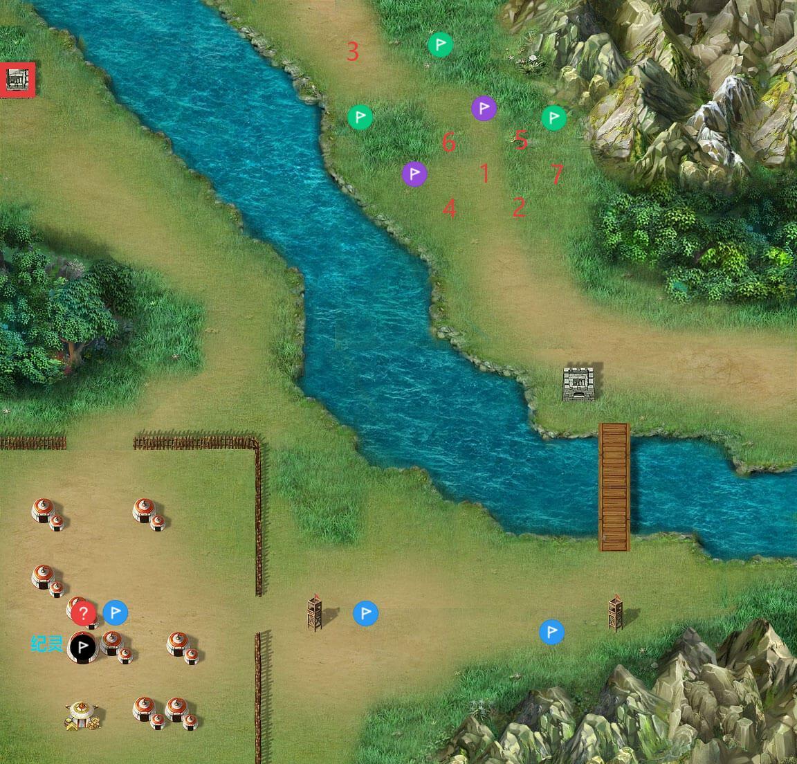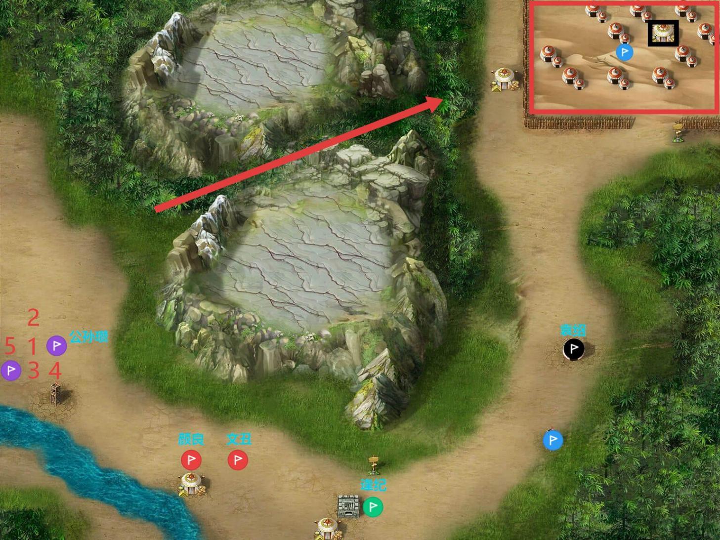 正常来说击退纪灵过关,步步为营往纪灵处打;若过河(即越过划线处)攻击吕布部队,吕布部队出击,胜利条件变更为全灭过关;建议打吕布,掉关羽装备,下一关击退不掉赤兔了