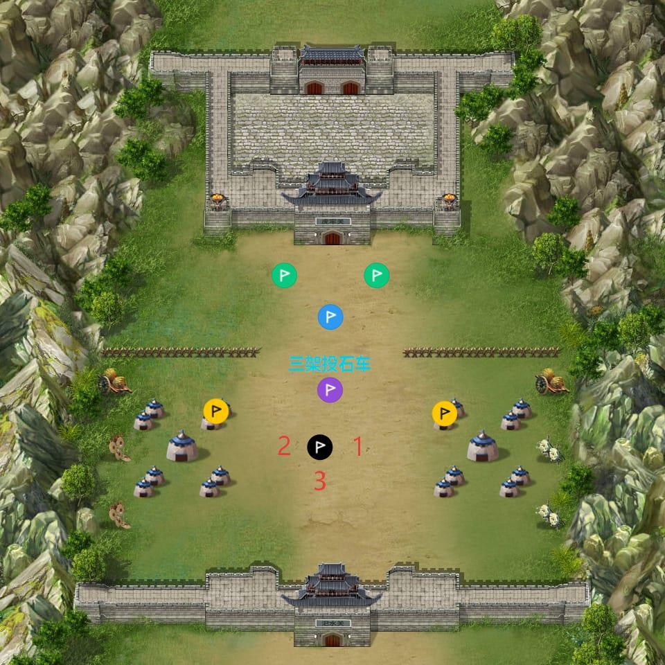 开局剧情吕布攮死两将,断武安国一臂,打退公孙瓒,张飞出战;第二回合刘备关羽出战,刘关张加攻防士敏;击退吕布或者吕布残血,触发剧情吕布撤退,上方高顺出战,击退后触发剧情出战投石车,绿旗处出现李傕郭汜援军;全灭援军或者保护至少一架投石车存活三回合过关。