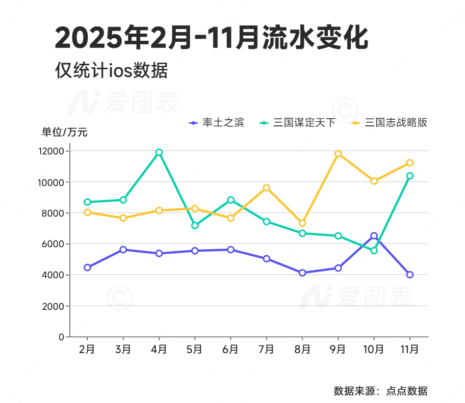 SLG头部中,三战的表现最为耀眼。每月流水基本是率土的两倍,上半年被三谋领先,后半年奋起直追。