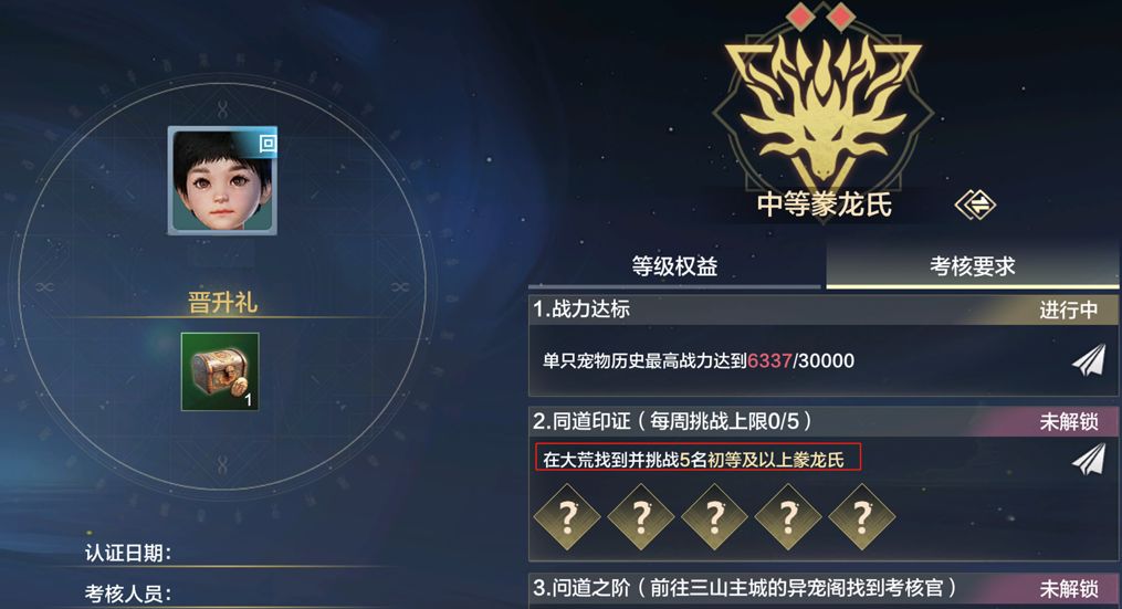 部分旅者反馈进阶考核胜利,但无法晋升,这里小策划也说明一下,中级豢龙氏及以后需要满足战力条件和同道印证(挑战足够次数的豢龙氏)次数,再通过晋升考核才能晋升~