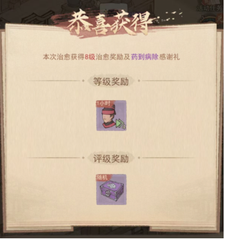 3,治病奖励:医馆内有4名患者等待取药,我们需要根据患者的病情,选择对症的药物交付,提交正确的药物后,将获得治愈奖励和患者的感谢奖励,治愈奖励与药物的等级有关,感谢奖励的品质与药物的品质,患者的病症严重程度以及标签是否契合有关。