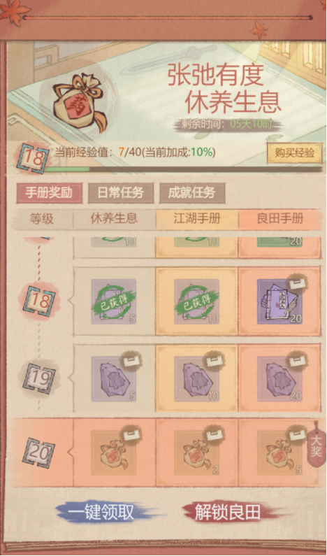 ③休养生息手册(不花钱)可以白嫖7个草药包;每日任务5个草药包(每天)。
