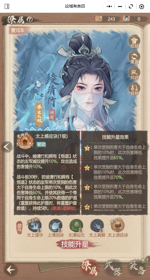3、太清仙元(被动),效果:自身威仪提升,并且给自身和主C增加攻击伤害及攻击力