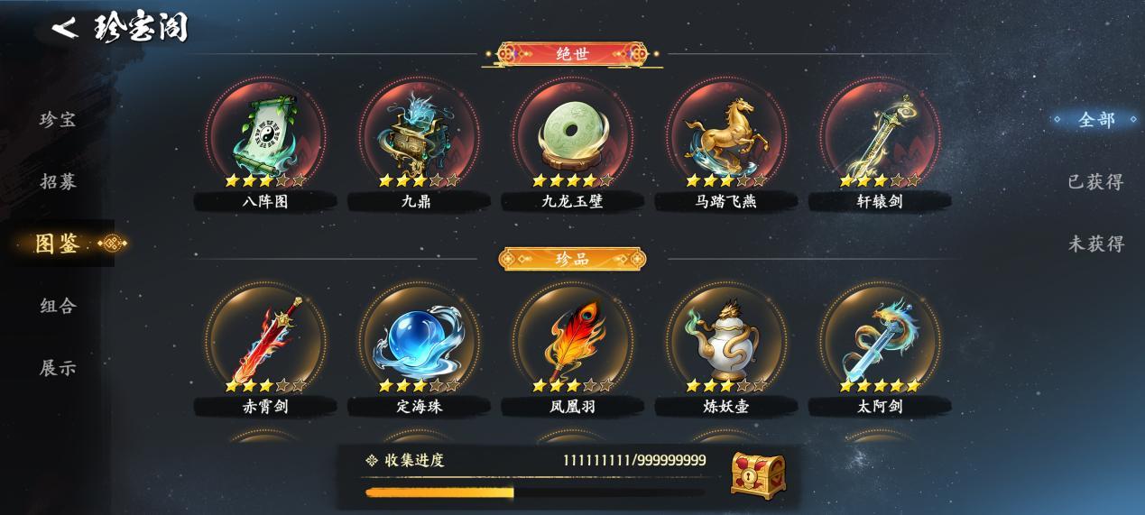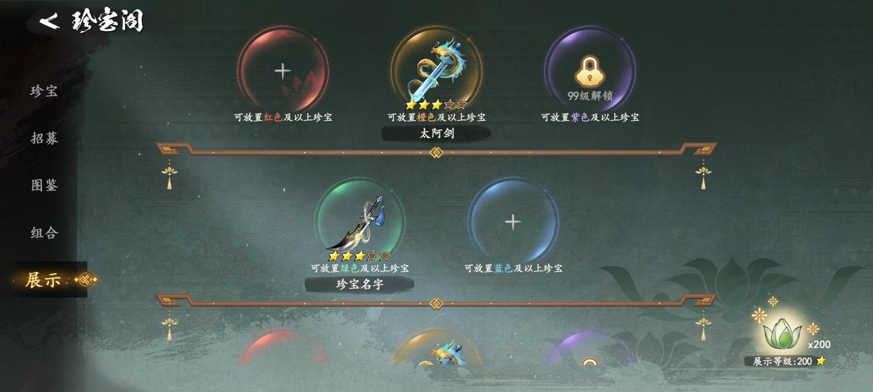 珍宝收藏(展台): 获得的珍宝不仅能看还能“赚”!将珍宝摆放在收藏展台上,系统将根据珍宝总星级,每日自动产出大量养成资源。躺着也能变强!