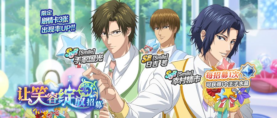 ★在本次招募中,玩家每次招募均可获得王子水晶,王子水晶可在活动交换所内兑换当期限定招募卡:王子水晶*150 可兑换SSR[Smile]手冢国光 *1