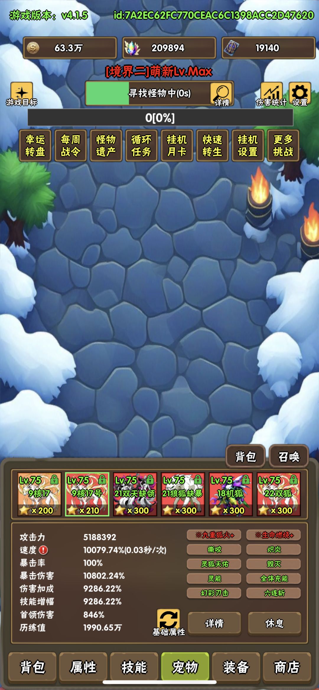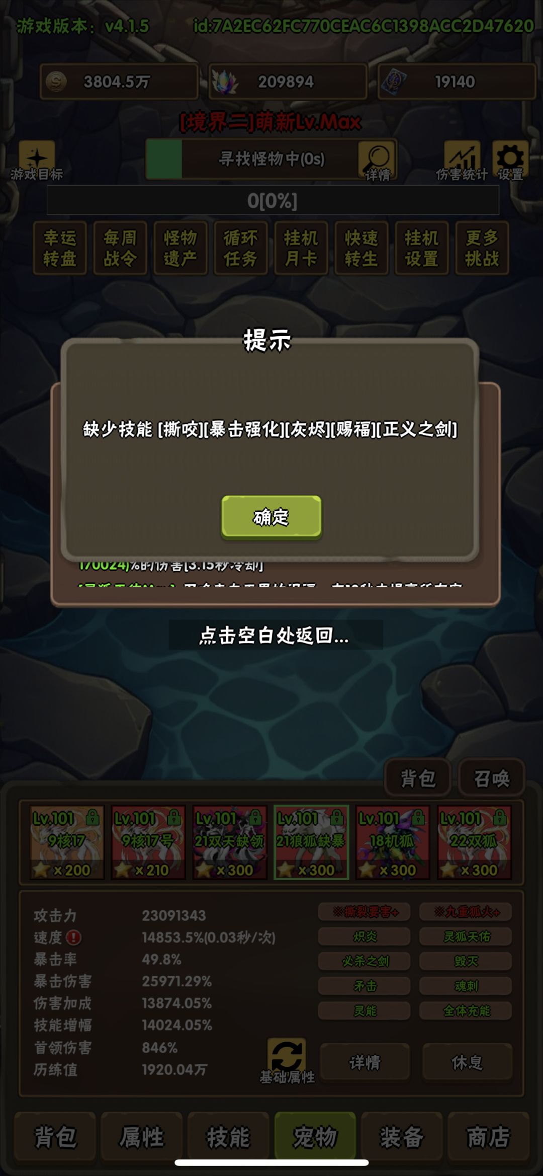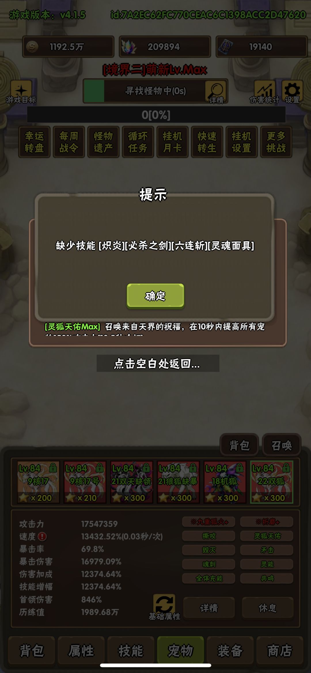 2、宠物:四满(3.0成长、3000绿字、300星)双子狐狸、机甲狐狸、双子天使、狼狐狸,加1个巫师狐狸(只有双天赋,没绿字,210星)和1个普通橙色200星狐狸,具体技能见图片。PS:双子狐狸、机甲狐狸是主要输出,放在最后两位,能让输出稳定些。
