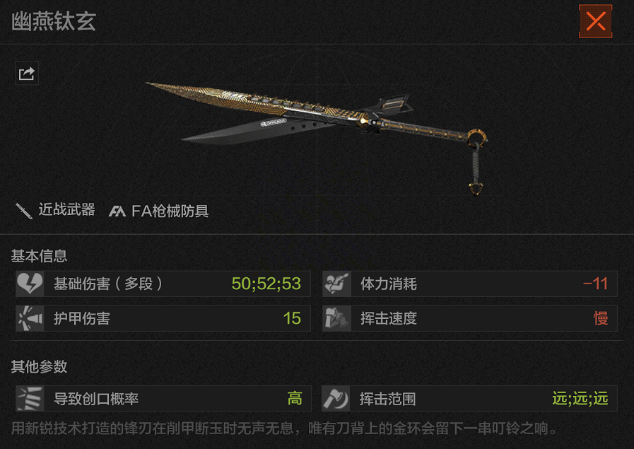 使用【幽燕钛玄】可以造成三段攻击。修长刀身带来先机之利,锋刃所至皆是致命杀招!前两击足以裂开二级头盔,最终一击,纵是三级头盔,亦是一击摧破。