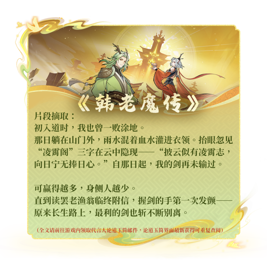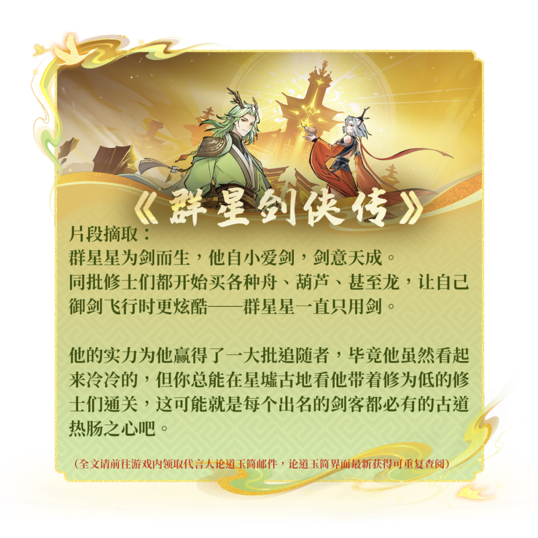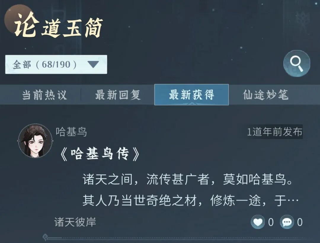 阅遍他们的传奇,你是否也有属于自己的篇章想要记录?无论你是独行万里,一剑光寒;还是与宗门同道并肩,共御强敌;亦或是于红尘之中,走出了属于自己的那条路——所有值得被铭记的修仙足迹,皆可在此延续。我们始终开放着 【论道玉简共创】的通道,期待更多值得被铭记的故事,能通过这样的形式,长久留存于这片天地之间。