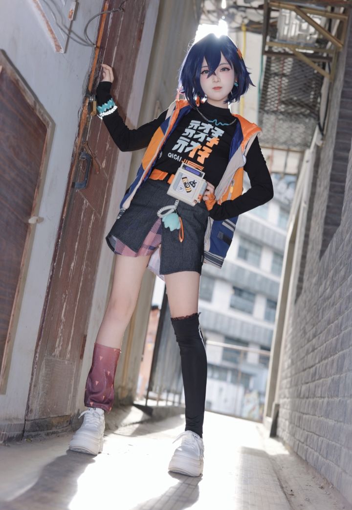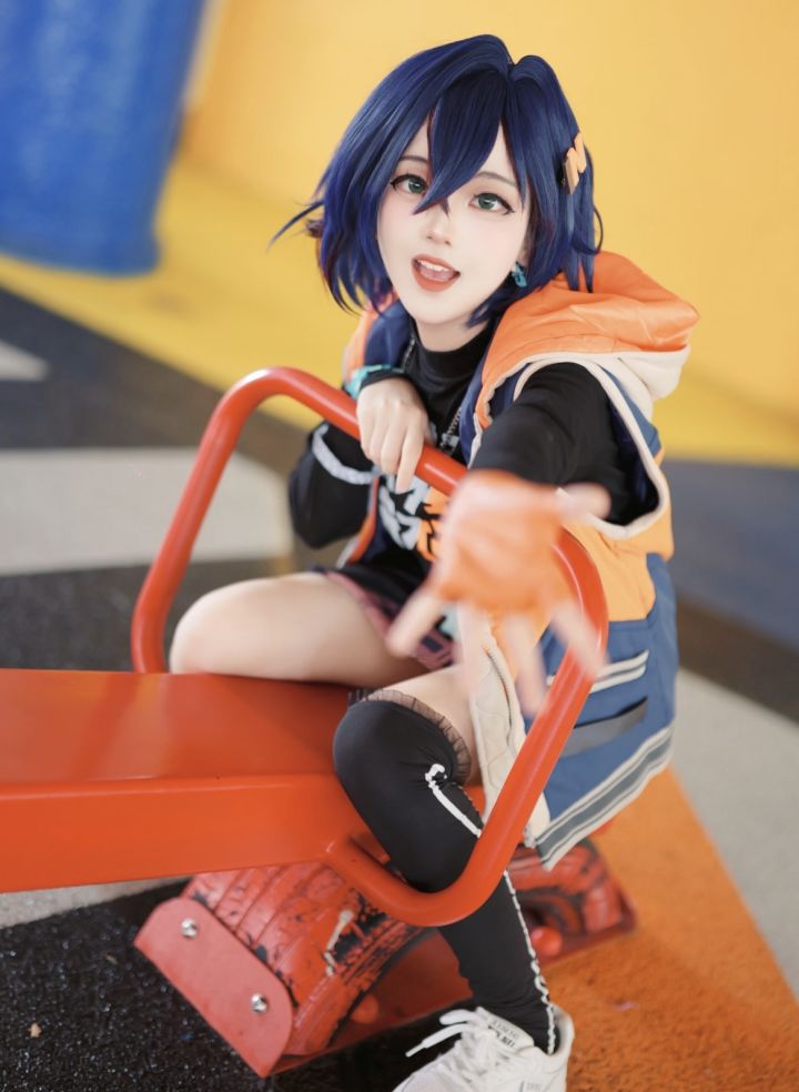 蓝紫发色的利落剪裁搭配橙黑撞色的穿搭,完美复刻角色的街头潮酷风格,坐姿的随性慵懒中透着角色的少年气与率真。背景的橙色机械装置与服饰的橙调相呼应,色彩搭配极具视觉冲击力,白色运动鞋的细节与腿部的穿搭层次丰富,妆面的清透感弱化了性别界限,却精准抓住了角色的灵动与不羁。从发型的细节到服饰的印花,每一处都贴合角色设定,将角色的鲜活与元气展现得活灵活现。
