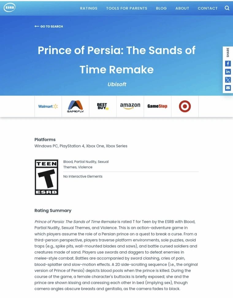 2026年1月13日,据外媒报道,育碧旗下命运多舛的经典IP重制作品《波斯王子:时之砂 重制版》正式出现在ESRB(美国娱乐软件分级委员会)数据库中,斩获T级(青少年级)评级,标志着游戏开发已进入收尾阶段,距离正式发售迈出关键一步。