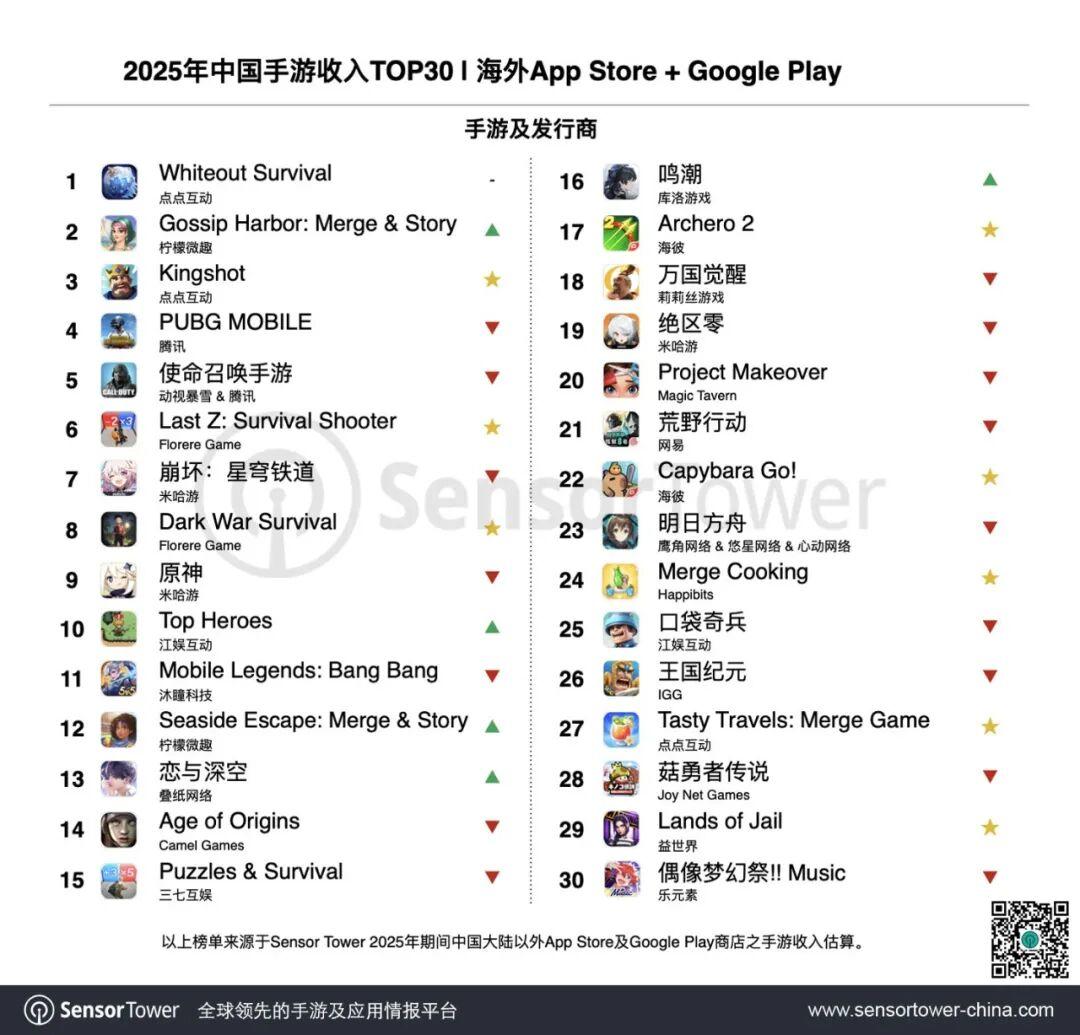 2025年《Kingshot》《Last Z: Survival Shooter》《Dark War Survival》《Archero 2》《Capybara Go!》《Merge Cooking》《Tasty Travels: Merge Game》《Lands of Jail》等共8款游戏首次入围出海手游收入榜TOP30。