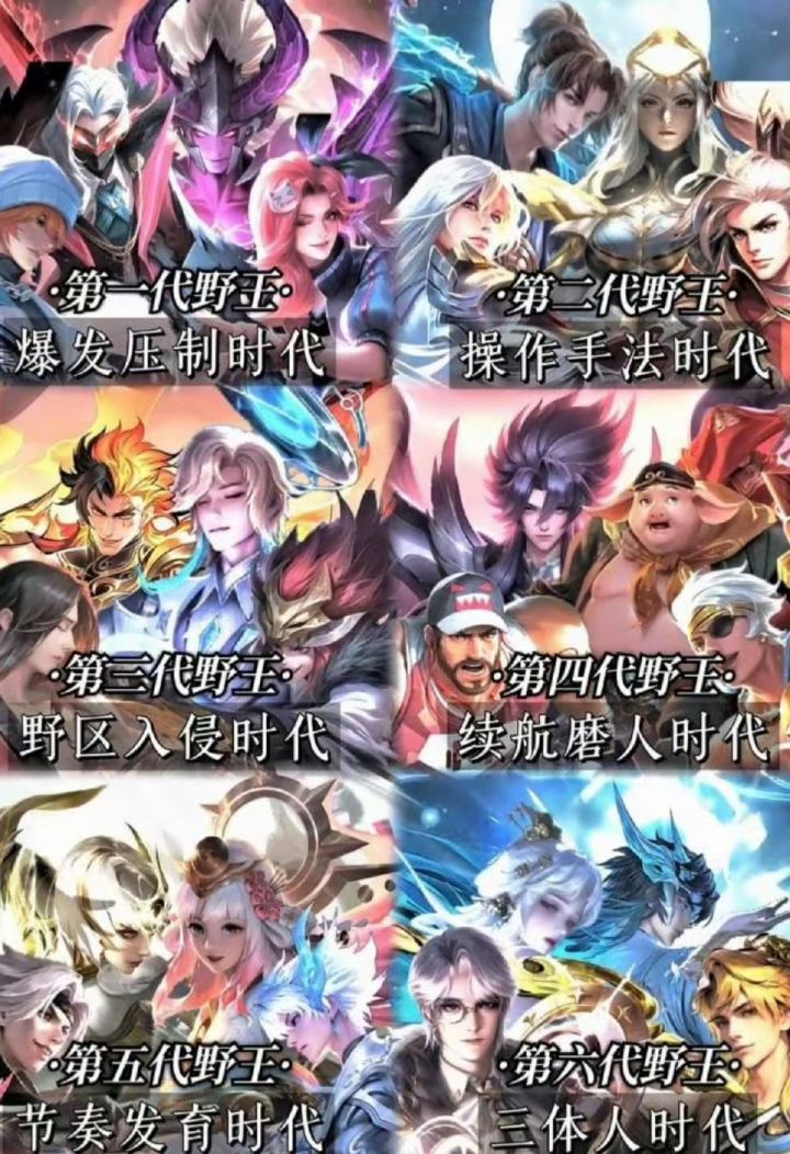 第一代靠爆发打压制,一套技能秒天秒地,讲究的就是见面即终结;第二代拼操作手法,指尖翻飞秀意识,细节拉满才能Carry;第三代玩野区入侵,把对面野区当自家后花园,经济碾压才是王道;第四代主打续航磨人,打不死就耗到你崩溃,持久战玩得溜;第五代重节奏发育,控龙带线滚雪球,全局节奏捏得死死的;到了第六代“三体人”时代,那更是集大成者,能打能守能运营,简直全能到离谱。