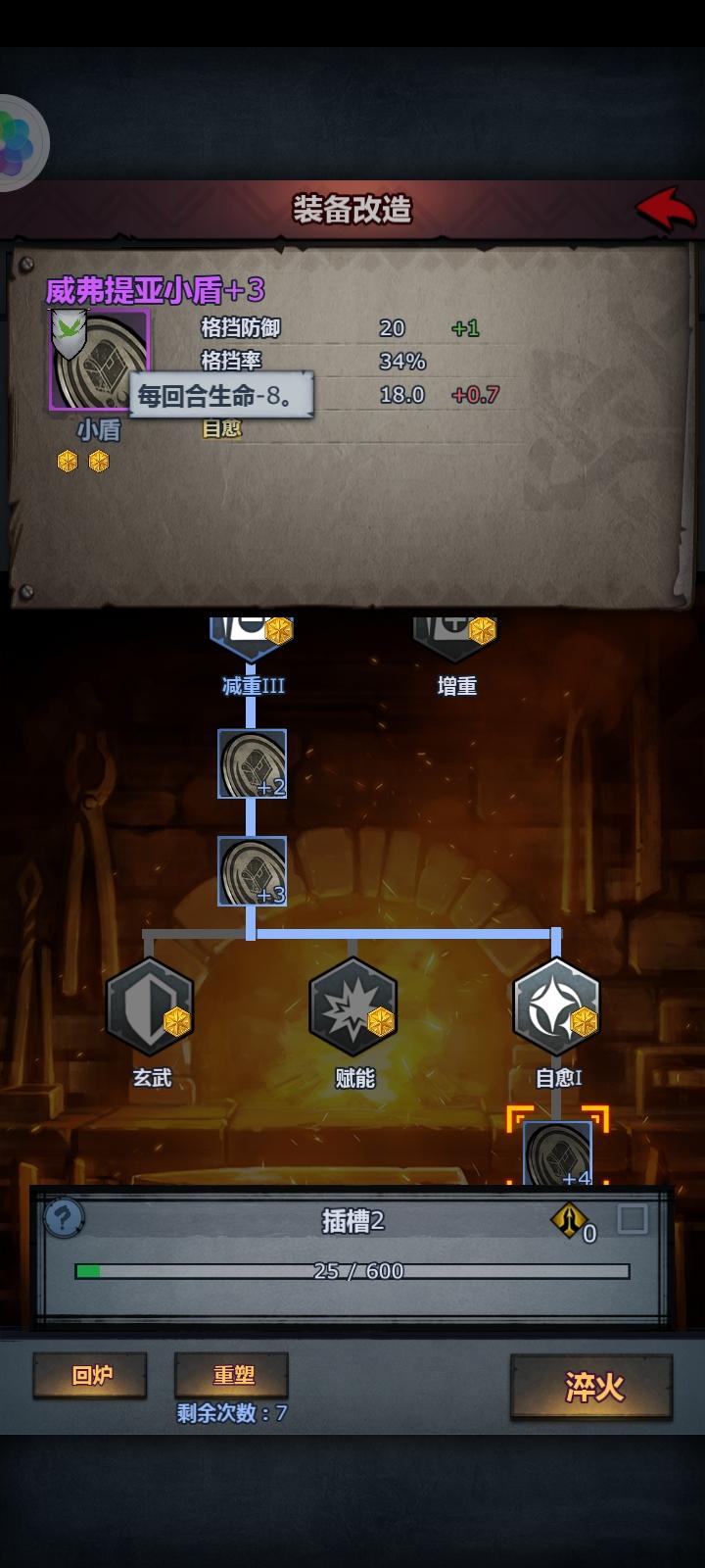 花费一枚灵魂结晶将一个小盾做成了传家宝,改造了六次出了一级自愈,开始不打任务了,也就守堡和海盗得去打一下