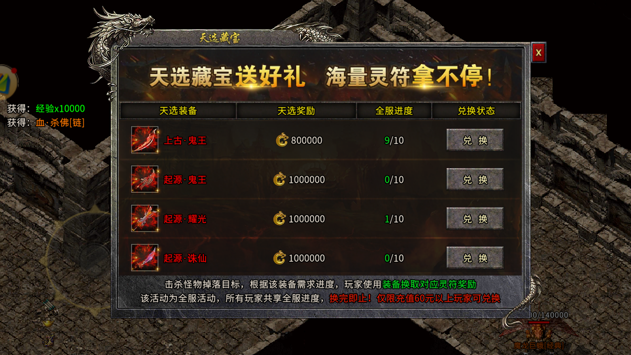 可能有兄弟想把灵符全砸装备强化,这里必须避坑。前期装备更新快,强化到+8就行,成功率100%还不浪费资源,把省下来的灵符囤着买血龙魄珠和洗髓丹,为后期神器突破做准备。毕竟后期高阶装备靠刷怪和首爆奖励就能拿到,没必要在前期装备上过度消耗。