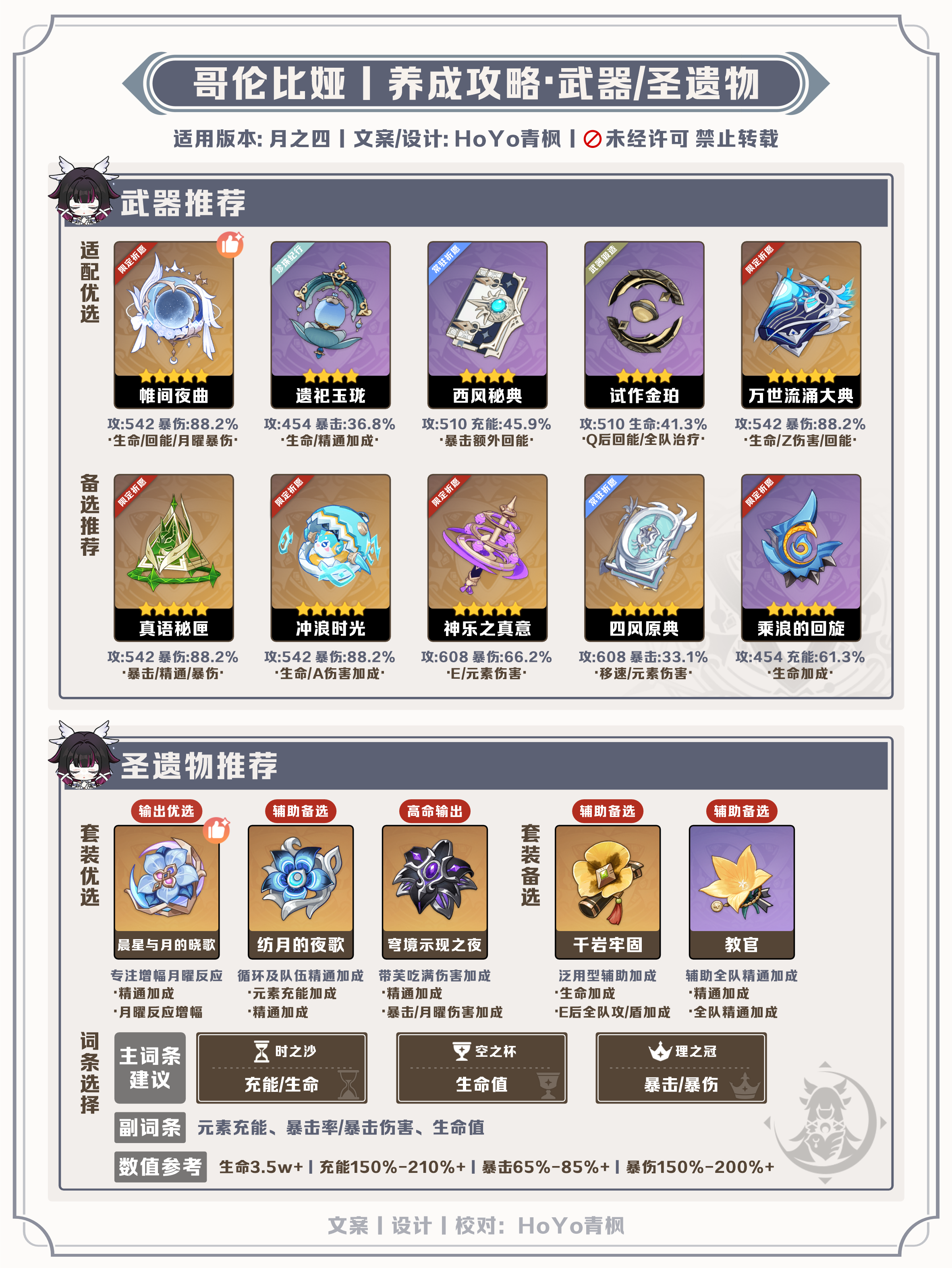 ●词条基于武器选择充能/生命沙、生命杯、双暴头,优先满足充能阈值稳定循环,装配专武单水180%~/双水150%~,非专武单水210%~/双水180%~,可按具体配装堆叠,满足循环后再主堆生命、双暴词条;