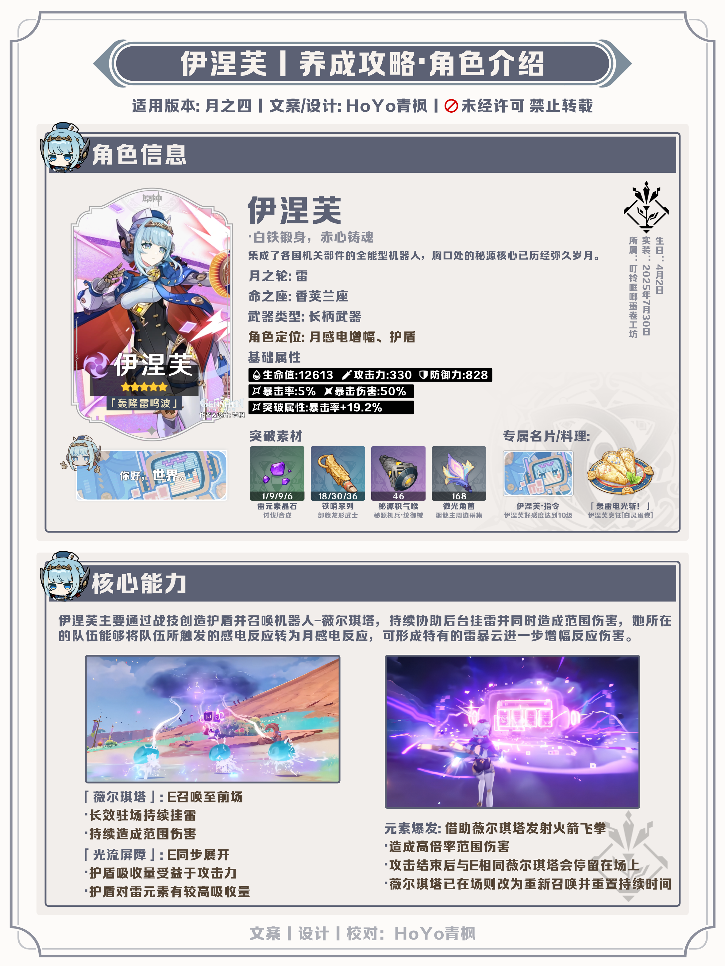 ✦『轰隆雷鸣波』·伊涅芙(雷),是一位通过护盾庇护队友、提供持续后台伤害,并使队伍中的角色可以触发月感电反应的雷元素辅助型角色。
