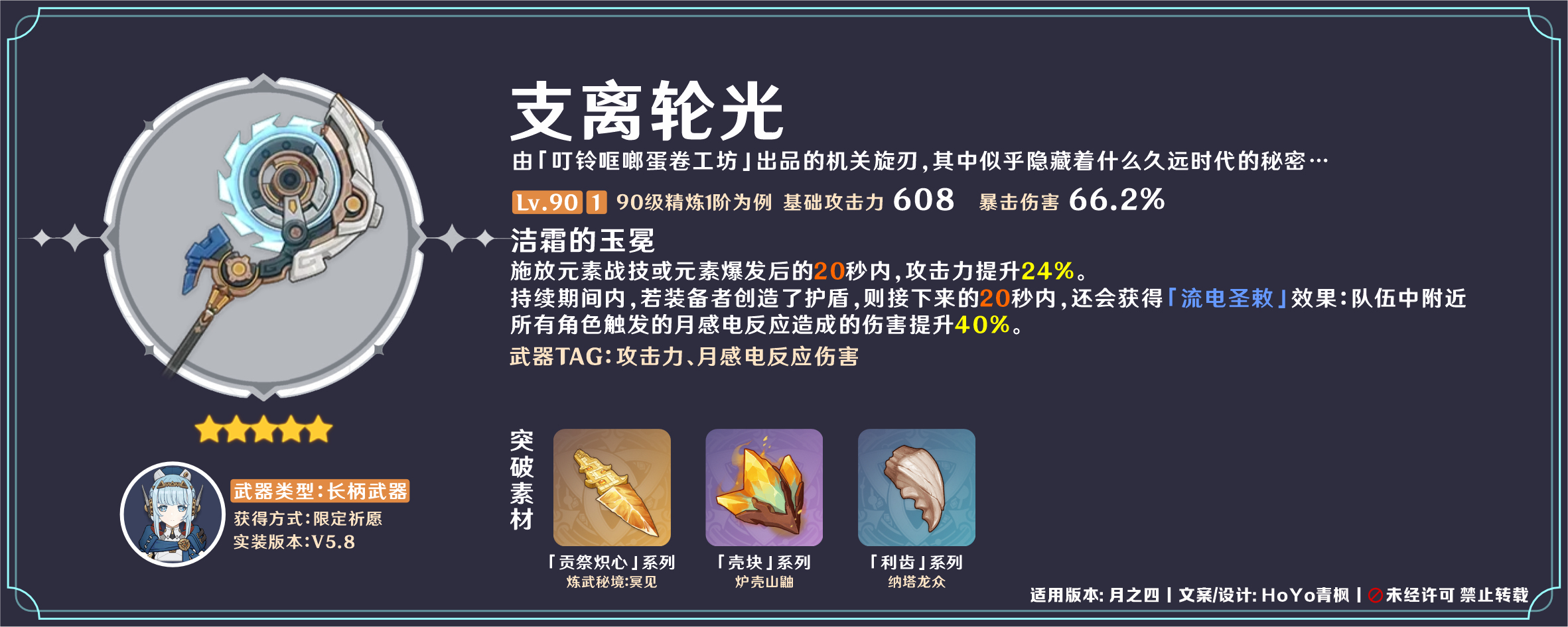 ●专属武器:副属性66.2%暴伤,提升契合的攻击、月感电反应加成稳定输出能力,攻击力可同步提升护盾强度,以及固有天赋的月感电倍率加成,兼顾输出和辅助能力;