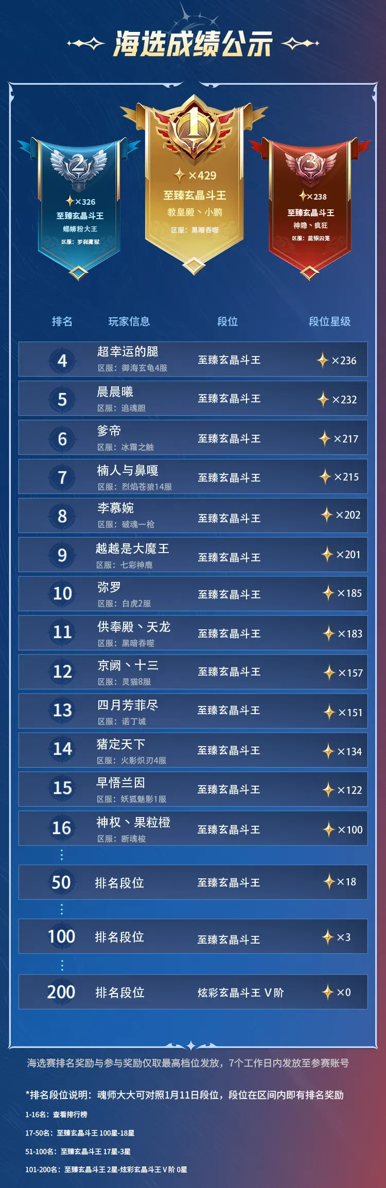 奖励领取说明:海选赛排名奖励与参与奖励仅取最高档位发放,7个工作日内发放至参与赛事账号。