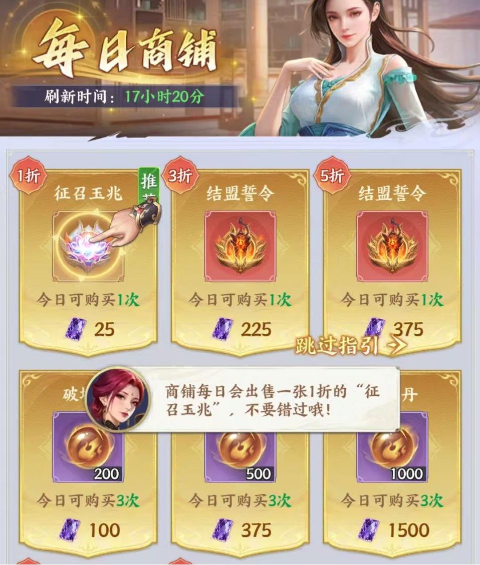 开启招募玩法后,除了每日均会有一抽免费招募外,进入商铺每日会有一折的【征召玉兆】这个可不能忘!说不定一发入魂就是S级/以上斗者!