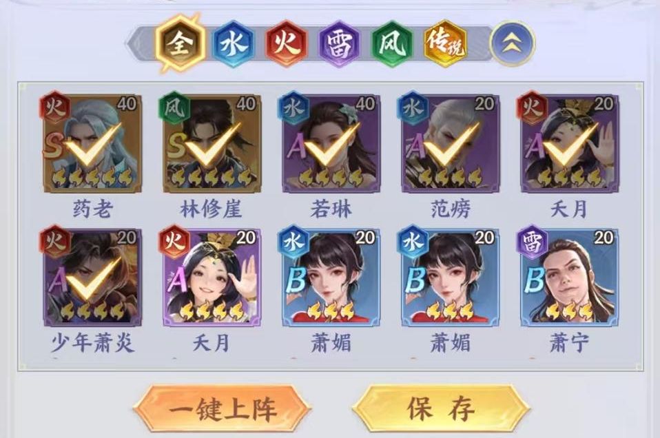 流派:开荒收割队队伍组成:药老+林修崖+任意火系角色*2+风系角色*2阵容分析:药老开局就能打出群攻,可放在一号位用于压低敌方血线,由二号位的林修崖收割,触发他的击杀再动完成清场。其他的火、风系角色提供羁绊,触发“双源争锋”组队加成(生命+10%、攻击+10%),实战中可不用出手。药老、林修崖练度足够时,本阵容可轻松打到第四章以上。注:玩家随指引进行第一次、第二次招募时,就能分别拿到林修崖和药老。